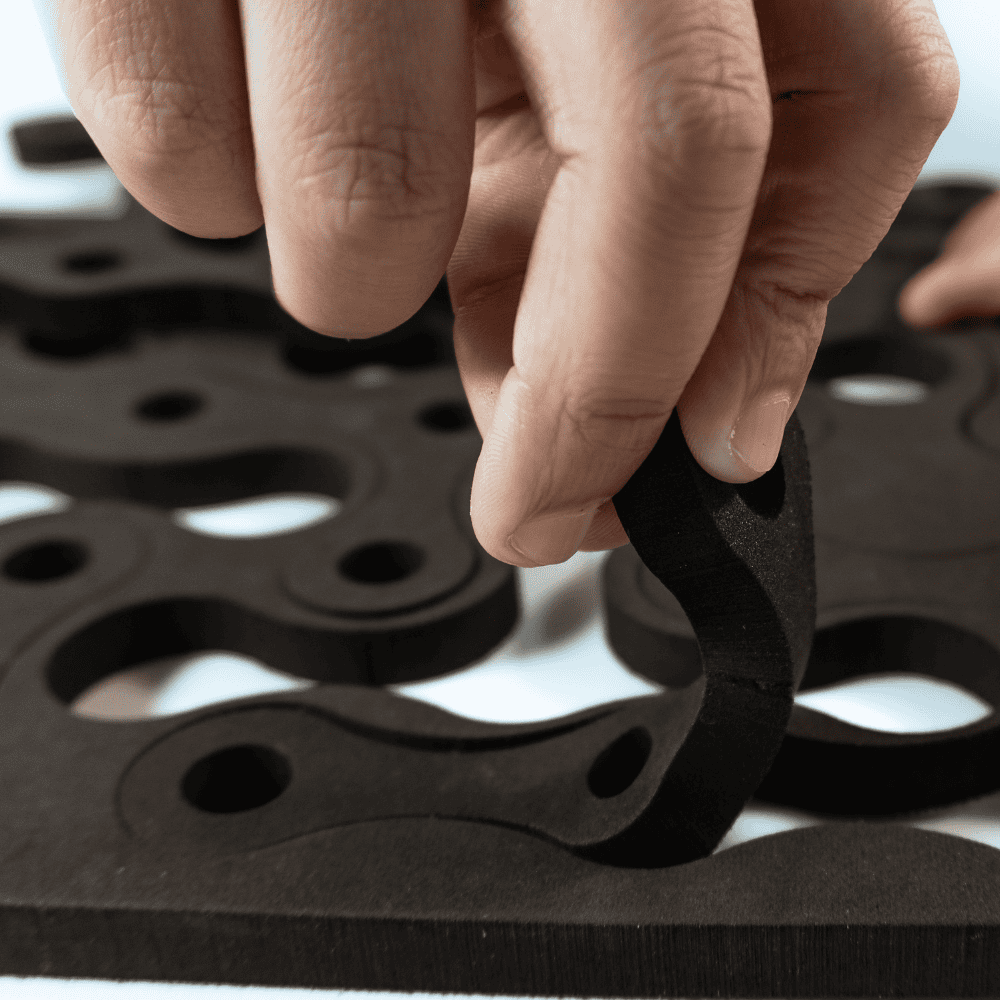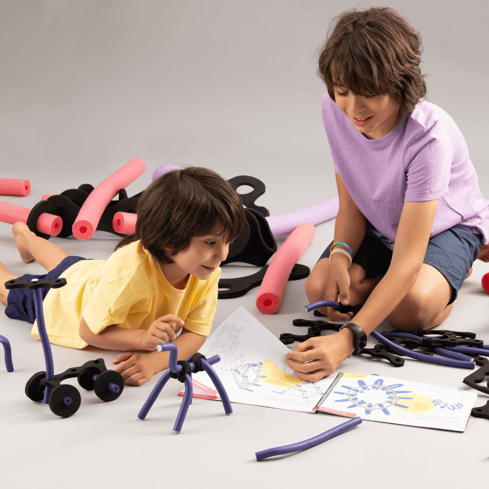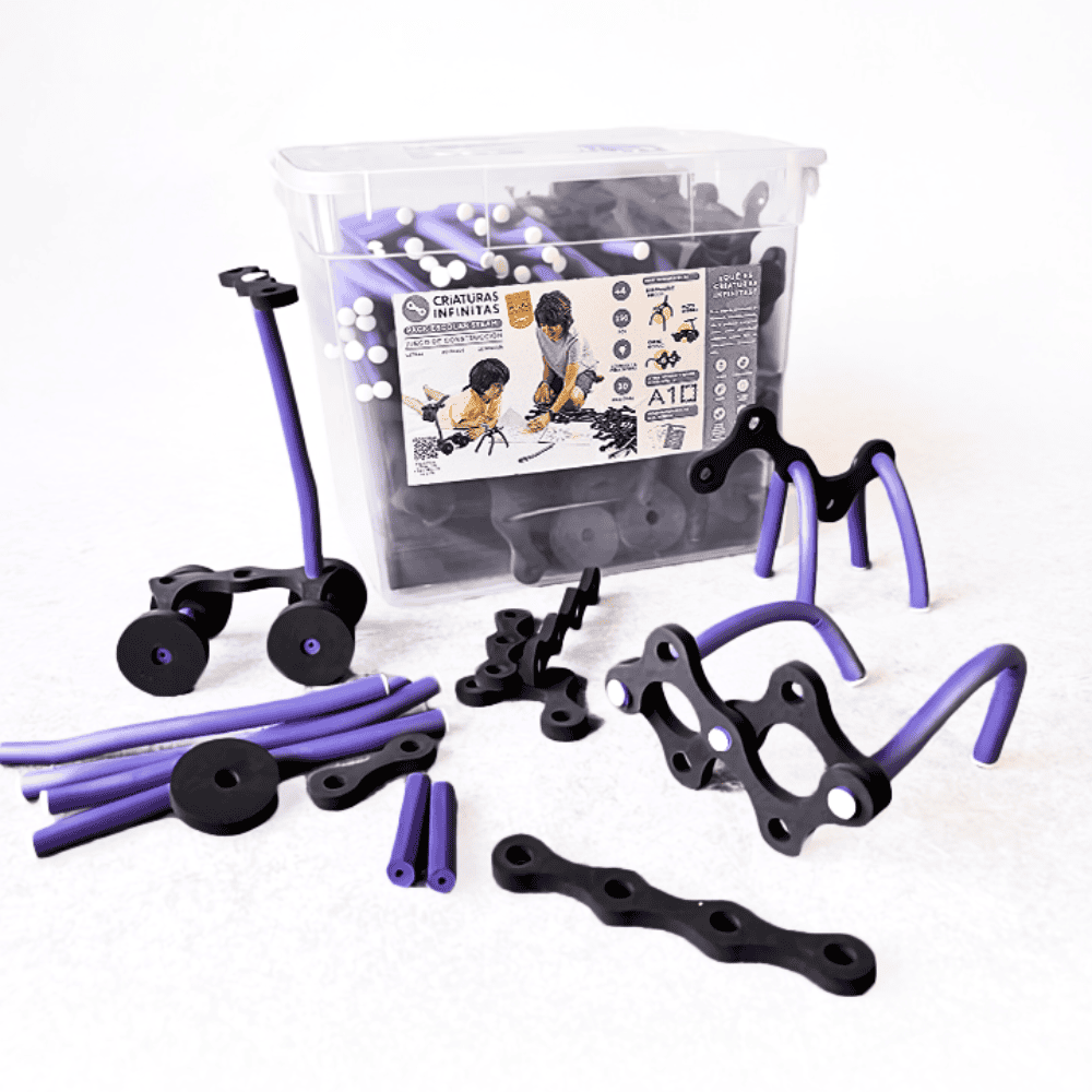 Es un juego de construcción único, hecho con piezas blandas de goma eva 100% de alta densidad que se conectan con bigudíes flexibles.